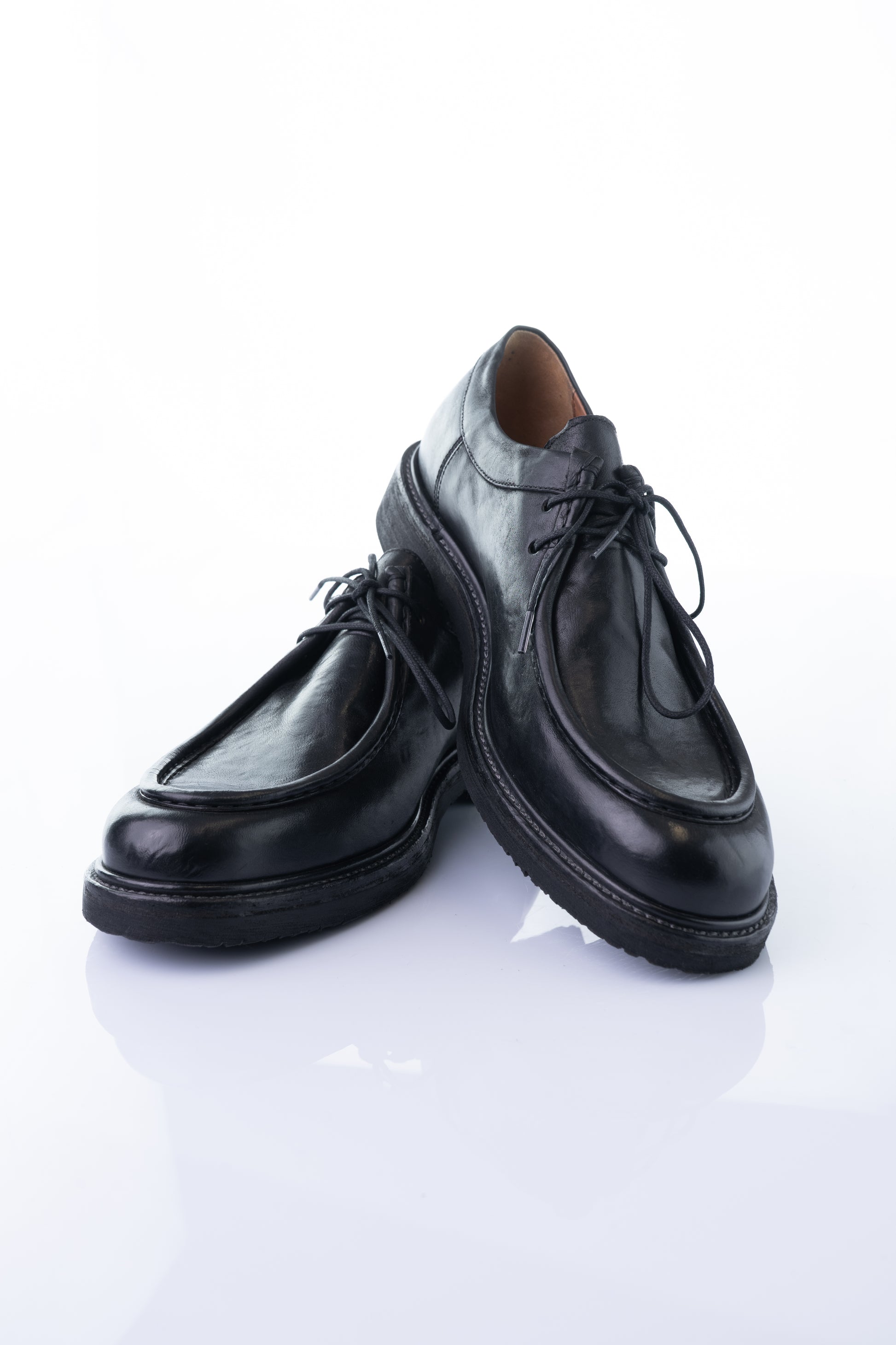 A distinctive black moc-toe Derby by Ducanero, crafted from Bandolero leather with a rugged full-rubber sole. A modern blend of artisanal texture and everyday durability.