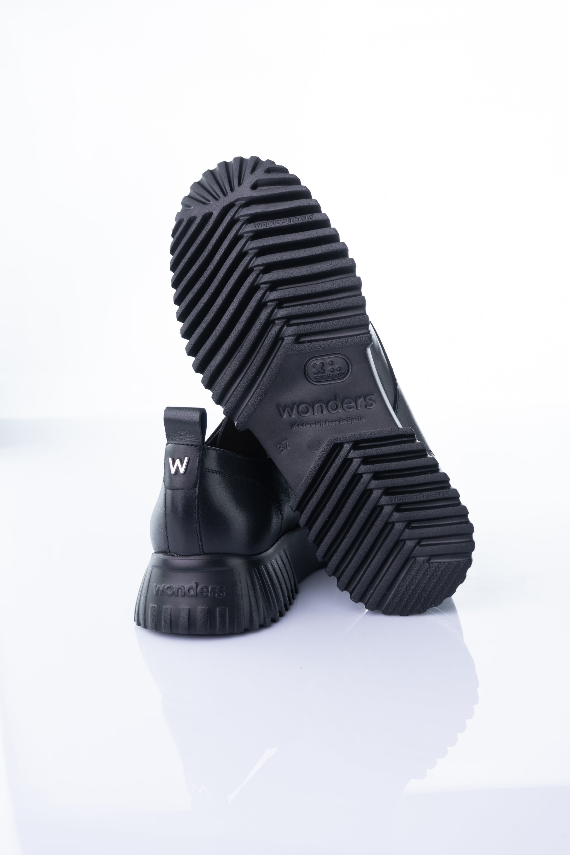 The Wonders A-4401 is a modern, chunky leather derby built on the brand’s ultra-light FlexFly sole. It combines a sleek, smooth leather upper with a bold sculpted platform, creating a comfortable yet fashion-forward everyday shoe.